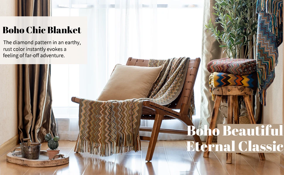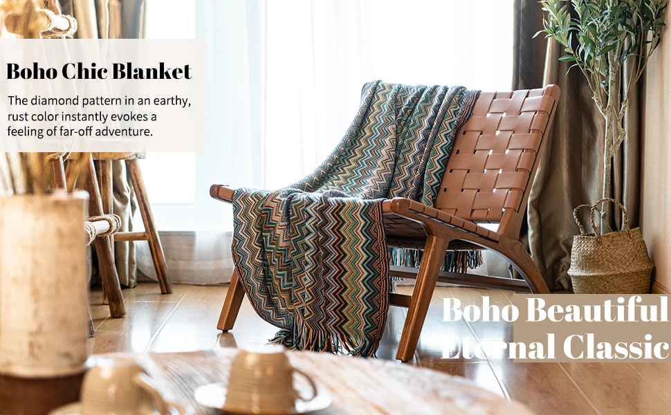Boho throws are composed of bright colors, delicate geometric patterns, and soft and beautiful tassels at both ends to make the blanket look very textured. You can decorate it anywhere in your home, such as beds, sofas, tables, chairs, etc, which will make the room look more vibrant.